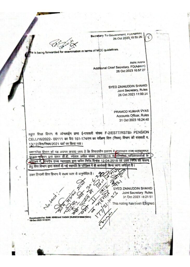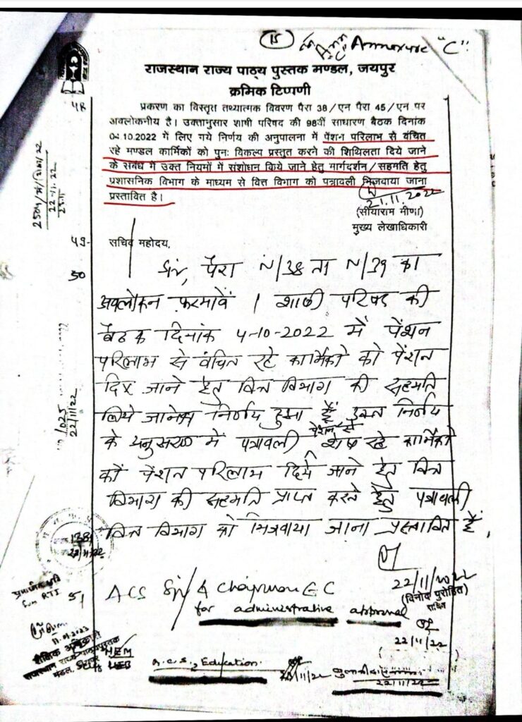 प्रार्थी का मण्डल अंशदान 13 लाख 85,485 रुपए मंडल कोष में जमा व शीर्ष संस्था शासी परिषद की दिनांक 4.10.2022 व 30 .06 2023 के बिंदु संख्या 98 . 12(III),99.15(III) व तत्कालीन स्कूल शिक्षा सचिव पीके गोयल बार तत्कालीन शिक्षा मंत्री बीडी कल्ला की दिनांक 22 11 2022 की प्रशासनिक स्वीकृति व वित्त विभाग की पैरा 177 / 31.10 .2023 की स्वीकृति सहमति उपरांत भी अगस्त 2015 से 2023 तक की पेंशन राशि न देकर आर्थिक व मानसिक रूप से प्रताड़ित किया।