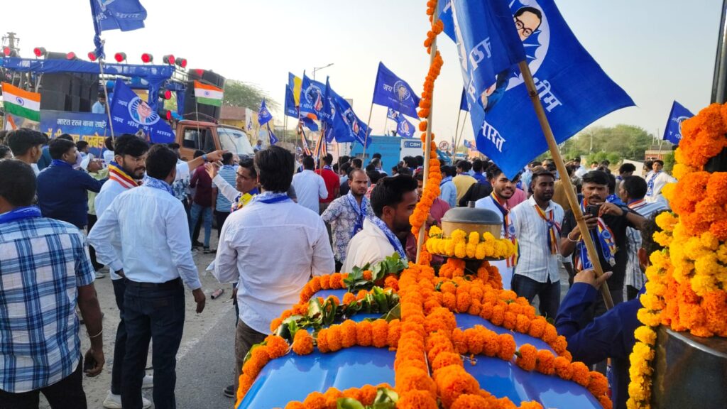 ढोल-नगाड़े, DJ पर ‘बाबा तेरा मिशन अधूरा’, और आसमान से होती पुष्प वर्षा। बंगाली मोहल्ले से जैसे ही पहली झांकी निकली, पूरा कस्बा ‘जय भीम’ से गूंज उठा।