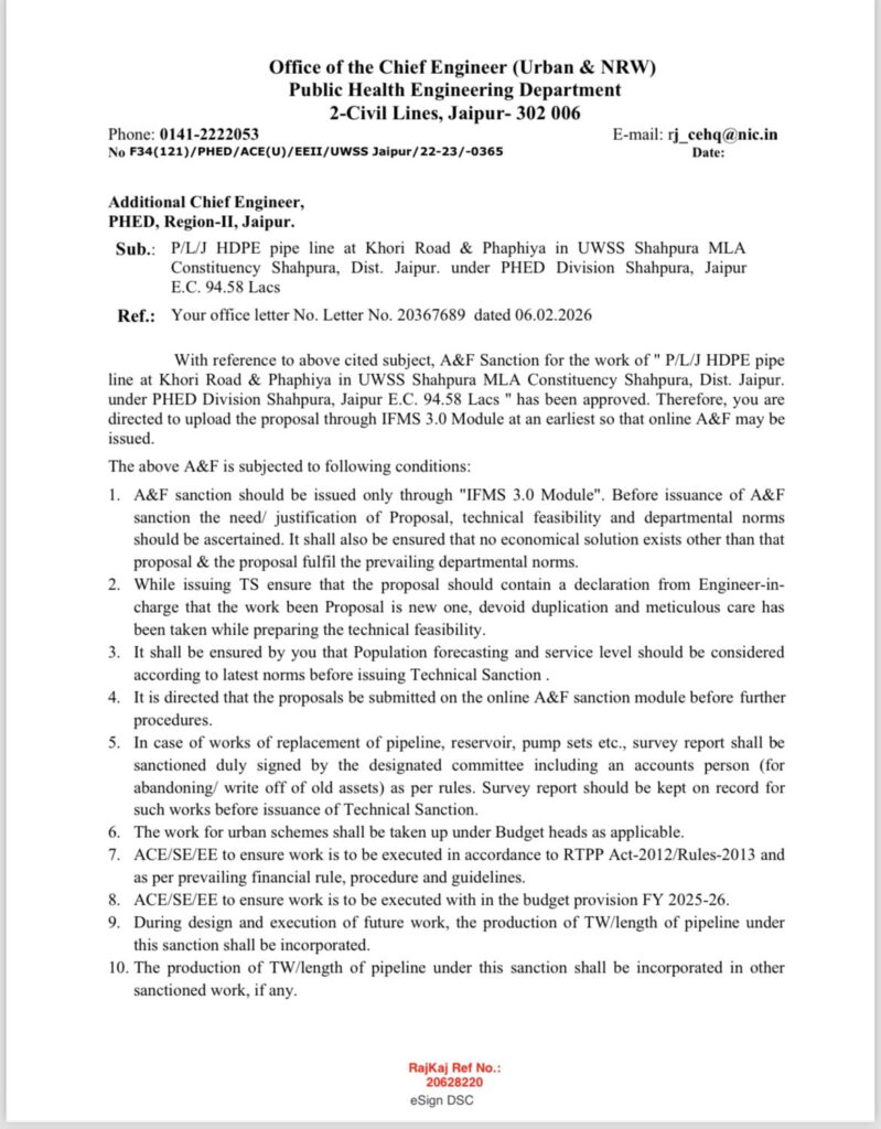 जानकारी के अनुसार, यह स्वीकृति क्षेत्र की पेयजल समस्या को देखते हुए जारी की गई है। नई पाइपलाइन बिछने से जल आपूर्ति व्यवस्था मजबूत होगी तथा गर्मी के मौसम में होने वाली दिक्कतों में कमी आएगी।