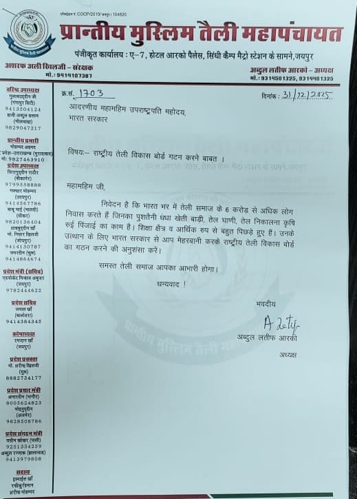 जयपुर। प्रांतीय मुस्लिम तेली महापंचायत के प्रदेश अध्यक्ष अब्दुल लतीफ आरको ने बताया कि तेली समाज के विकास,उत्थान सामाजिक विकास शिक्षा के लिए प्रांतीय तेली महापंचायत के प्रदेश संरक्षक पूर्व राज्य मंत्री अशरफ अली खिलजी ने भारत के महामहिम उपराष्ट्रपति सीपी राधा कृष्णन से मुलाकात की तथा उनसे मिलकर तेली समाज के विकास का एक मांग पत्र सौंपा।