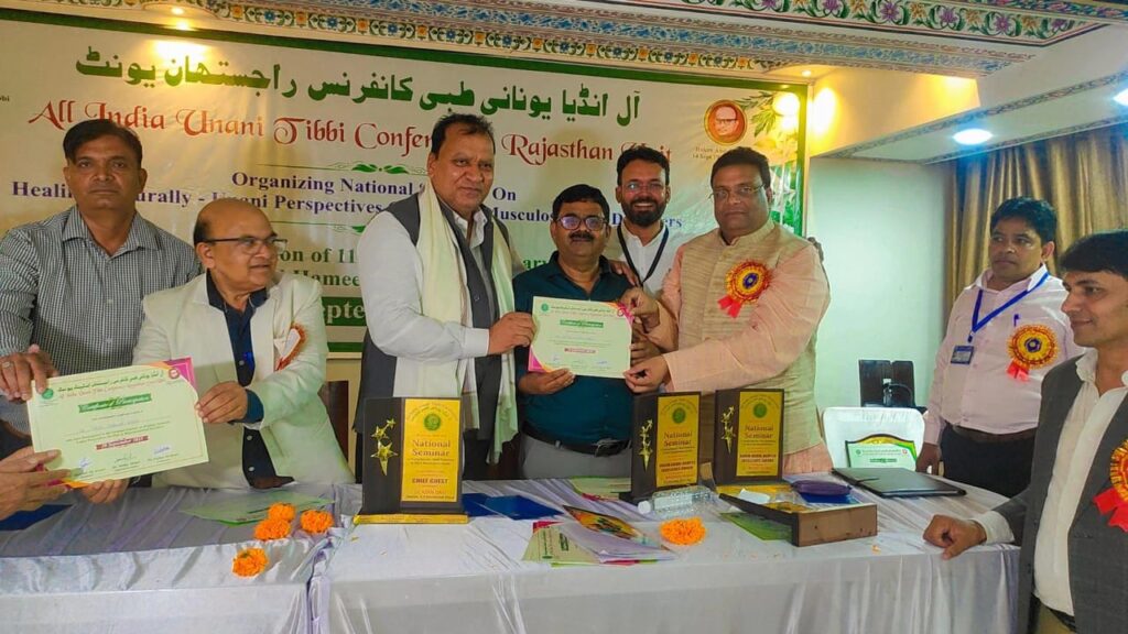 ऑल इंडिया यूनानी तिब्बी कॉन्फ्रेंस राजस्थान स्टेट की जानिब से एक दिवसीय राष्ट्रीय कॉन्फ्रेंस का आयोजन किया गया, सेमिनार का आगाज़ डॉ अता-उर-रहमान ने कुरान की तिलावत के साथ किया, सेमिनार के कन्वीनर डॉ फरहत अली ने स्वागत भाषण से अतिथियों का गर्मजोशी से स्वागत किया है,और सेमिनार का संक्षिप्त परिचय दिया, सेमिनार मे मुख्य अतिथि के तौर पर जे एल एन ग्रुप आफ इंस्टीट्यूशंस राजस्थान के संस्थापक निदेशक डॉक्टर आजम बैग और विशेष अतिथि (ऒएसडी, मुख्यमंत्री राजस्थान सरकार ) डॉ गोविंद पारीख जी रहे,विशिष्ट अतिथि के तौर पर डॉ मनमोहन खींची, डॉ हरनाथ सिंह गोरा, प्रो. शोएब आज़मी ने शिरकत की, सेमिनार मे डॉ.मोहम्मद अकमल ने मस्कुलर डिजीज पर अपना व्याख्यान दिया,उन्होंने जोड़ों के दर्द से जुड़ी सूजन को कम करने के लिए आहार में बदलाव की सलाह दी और जीवनशैली में बदलाव:जोड़ों के स्वास्थ्य को बेहतर बनाने और दर्द को नियंत्रित करने मे फायदेमंद बताते हुए,पर्याप्त आराम करने और उचित शारीरिक गतिविधि सहित जीवनशैली में बदलाव पर ज़ोर दिया। डॉ. सरफ़राज़ अहमद ने “थैरेप्युटिक अप्रोच ऑफ यूनानी मेडिसिन इन मैनेजमेंट ऑफ़ क़ूबा (डर्माटोफाइटोसिस)” विषय पर बोलते हुए त्वचा रोगों में यूनानी औषधियों और उपचारों की उपयोगिता को स्पष्ट किया। उन्होंने विशेष रूप से उन यूनानी दवाओं का उल्लेख किया जिनमें प्राकृतिक एंटीफंगल गुण पाए जाते हैं और जो बिना दुष्प्रभाव के रोगियों को स्थायी लाभ देती हैं। कॉन्फ्रेंस के अध्यक्ष डॉ शौकत अली अंसारी ने कहा की स्वर्गीय जनाब हकीम अब्दुल हमीद एक प्रसिद्ध चिकित्सक और हमदर्द (वक्फ) के संस्थापक थे,उनकी जयंती के अवसर पर प्रत्येक वर्ष सर्वश्रेष्ठ यूनानी चिकित्सक पुरस्कार उन चिकित्सकों के लिए पूर्व-निर्धारित किया जाता है जिन्होंने राज्य स्तर पर यूनानी चिकित्सा प्रबंधन और शिक्षा के क्षेत्र में अपनी उत्कृष्ट सेवा प्रदान की है। विशिष्ट श्रेणियों और मानदंडों के आधार पर, इन पुरस्कारों को सम्मान के तौर पर दिया जाता है,इस अवसर पर यूनानी चिकित्सा क्षेत्र में उत्कर्ष कार्यों के शैक्षणिक क्षेत्र में उत्कृष्ट योगदान के लिए डॉ.मोहम्मद अकमल, डॉ.सरफराज अहमद यूनिवर्सिटी कॉलेज ऑफ यूनानी टोंक, यूनानी मे उत्कृष्ट सेवाओं के लिए डॉ.शमशुल हसन भरतपुर, डॉ.बाबर हुसैन भीलवाड़ा, डॉ.मकबूल अहमद, डॉ.फरहान, डॉ.अब्दुल वाहिद जयपुर, बासित खान ( मामू दवाखाना ) टोंक को हकीम अब्दुल हमीद उत्कृष्टा पुरस्कार 2025 एवं वरिष्ठ यूनानी चिकित्सक डॉ मोहम्मद रोशन, डॉ अमजद अली, डॉ शाइनी जुल्फकार को स्वर्ण प्रशंसा पुरस्कार (गोल्ड एप्रिसिएशन अवार्ड) से सम्मानित किया गया। टेक्निकल विंग से डॉक्टर अययुब एवं अन्य मेम्बर को भी सम्मानित किया गय