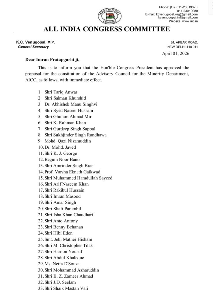 सलाहकार परिषद (Advisory Council) का सदस्य बनाने हेतु मैं मल्लिकार्जुन खड़गे, नेता प्रतिपक्ष राहुल गांधी, संगठन महासचिव केसी वेणुगोपाल एवं नेता कांग्रेस अल्पसंख्यक विभाग के राष्ट्रीय अध्यक्ष इमरान प्रतापगढ़ी का एम.डी.चोपदार ने हार्दिक आभार व्यक्त किया है। चोपदार ने कहा कि मैं यह विश्वास दिलाता हूँ कि मुझे सौंपी गई जिम्मेदारी का निर्वहन पूर्ण निष्ठा, ईमानदारी और समर्पण के साथ करूँगा।