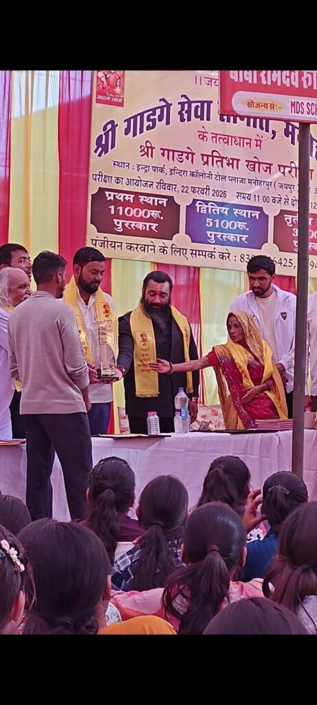 मनोहरपुर (जयपुर)। श्री गाडगे सेवा समिति मनोहरपुर के तत्वाधान में आयोजित श्री गाडगे प्रतिभा खोज परीक्षा का आयोजन किया गया। समिति के अध्यक्ष विक्रम सिंह धोलीवाल जी ने बताया की कॉलेज स्तर पर प्रथम विजेता को 11000 द्वितीय विजेता को 5100 तृतीय विजेता को ₹2100 की राशि प्रदान की गई।