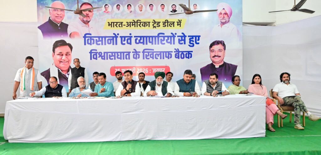 जयपुर। अमेरिका से केन्द्र सरकार द्वारा की गई ट्रेड डील के कारण राजस्थान प्रदेश के किसानों, उद्यमियों, हैण्डीक्राफ्ट व्यवसायियों को होने वाले नुकसान तथा हितों पर पडने वाले विपरीत प्रभाव के विरूद्ध प्रदेश में आन्दोलन प्रारम्भ करने व आन्दोलन की रूपरेखा तैयार करने हेतु राजस्थान प्रदेश कांग्रेस कमेटी के अध्यक्ष गोविन्द सिंह डोटासरा ने आज प्रदेश कांग्रेस मुख्यालय, इन्दिरा गॉंधी भवन, स्टेशन रोड, जयपुर पर जिला कांग्रेस कमेटियों के अध्यक्षों, प्रदेश कांग्रेस समन्वय समिति के सदस्यों, हनुमानगढ़ व श्रीगंगानगर जिले के विधायकों, विधायक प्रत्याशियों, सांसद, पूर्व सांसद, सांसद प्रत्याशी, अग्रिम संगठन के प्रदेशाध्यक्षों की एक महत्वपूर्ण बैठक ली। बैठक में एआईसीसी प्रभारी सुखजिन्दर सिंह रंधावा, नेता प्रतिपक्ष टीकाराम जूली, पूर्व प्रदेशाध्यक्ष डॉ. सी. पी. जोशी, सहप्रभारी एआईसीसी रित्विक मकवाना, चिरंजी राव, एआईसीसी सचिव श्रीमती रेहाना रियाज भी शामिल रहे।