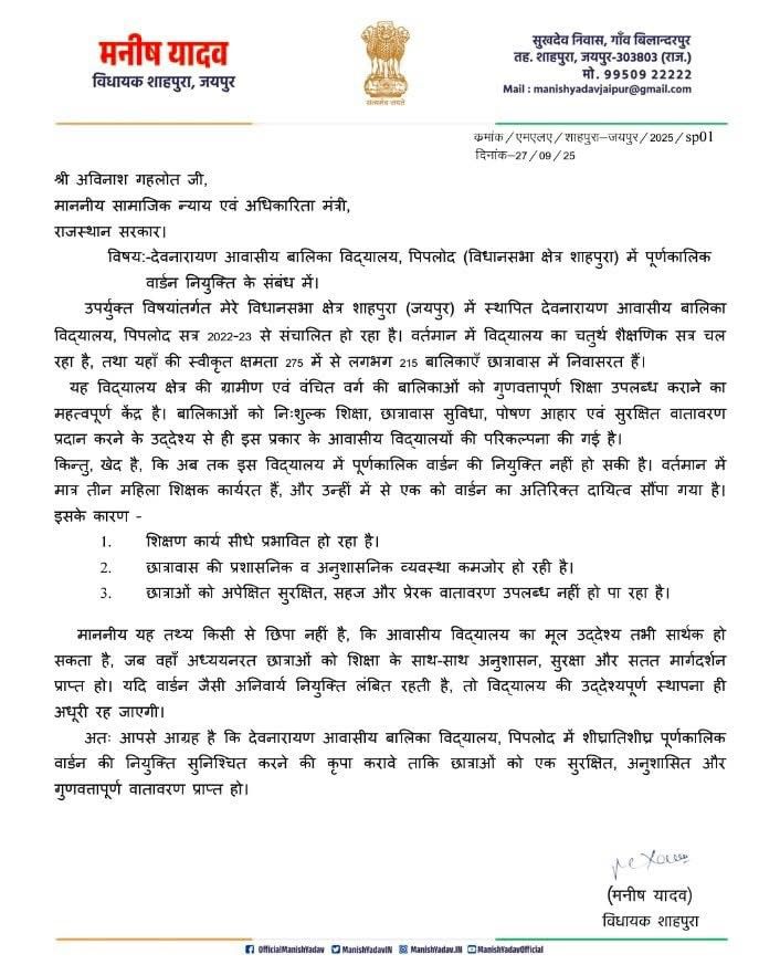 शाहपुरा (जयपुर)। स्थानीय विधायक मनीष यादव ने सामाजिक न्याय एवं अधिकारिता मंत्री अविनाश गहलोत को पत्र लिखकर देवनारायण आवासीय बालिका विद्यालय, पिपलोद में पूर्णकालिक वार्डन की नियुक्ति की माँग की है।
