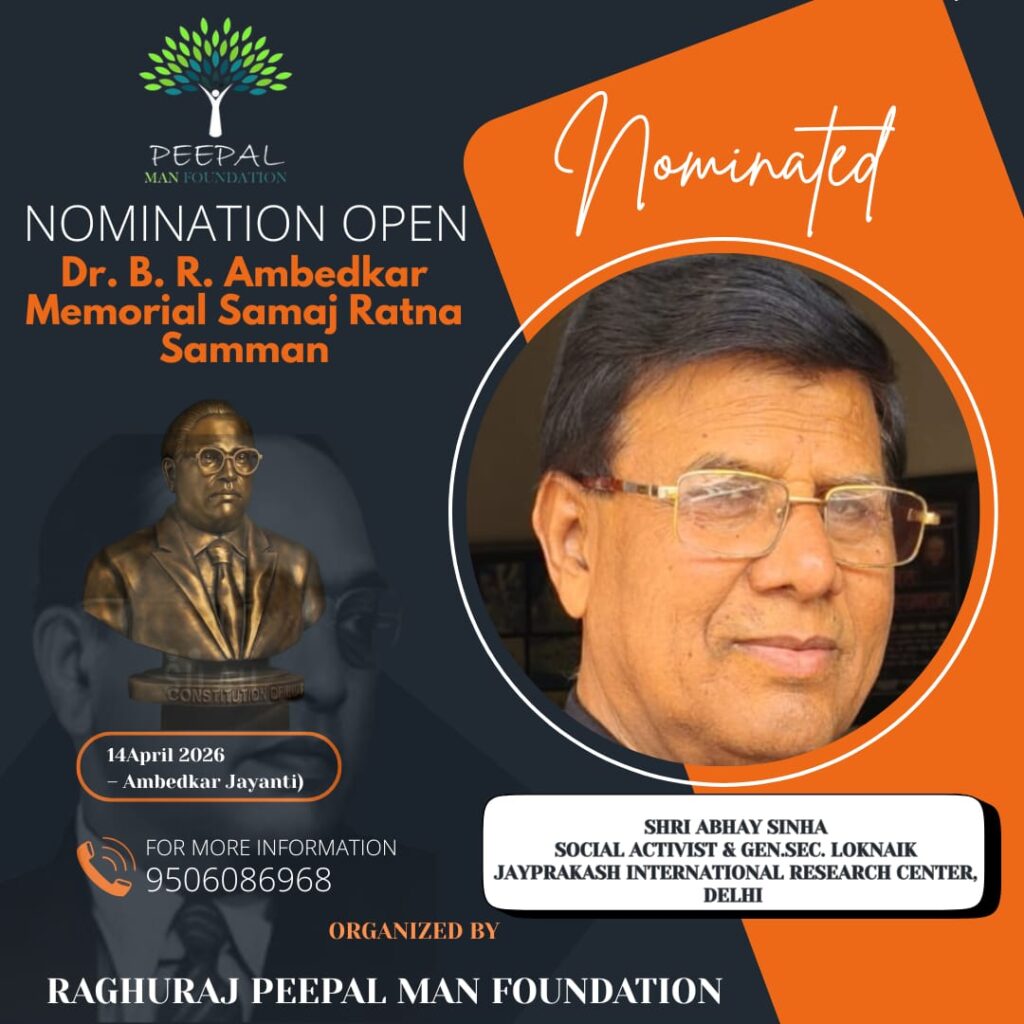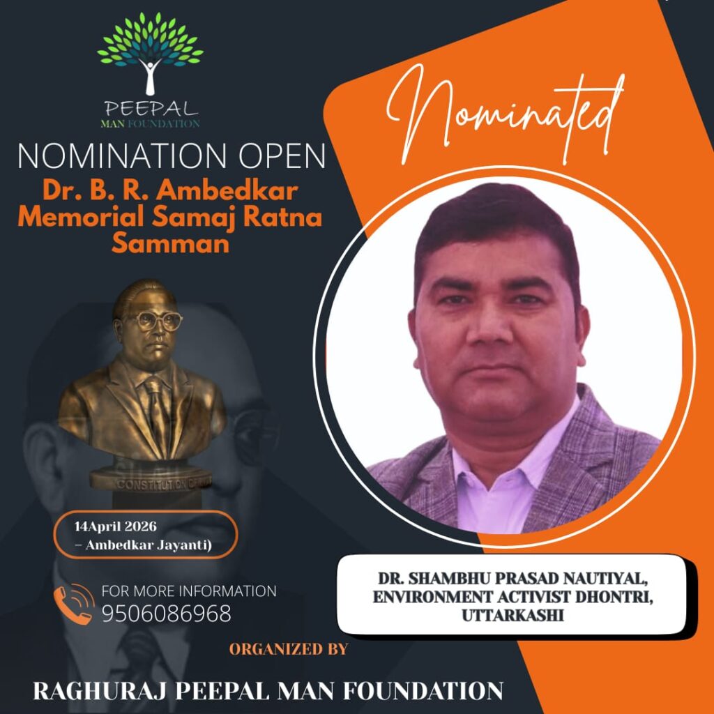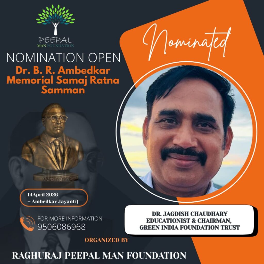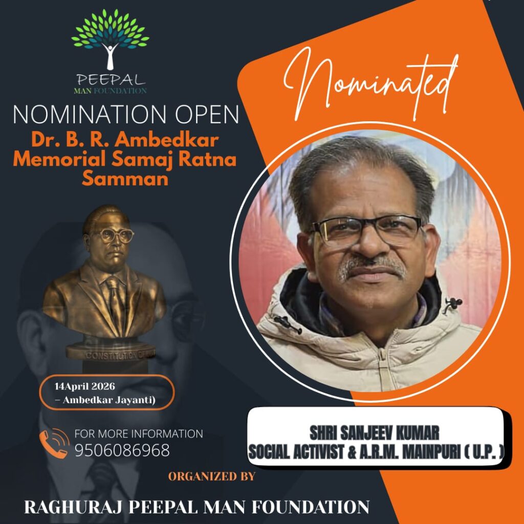 नयी दिल्ली। पीपलमैन फाउन्डेशन द्वारा भारत रत्न डा. बी.आर. अम्बेडकर मैमोरियल समाज रत्न सम्मान हेतु समाज में विभिन्न क्षेत्रों में अपनी अमूल्य सेवाएं देने वाले प्रमुख लोगों को नामांकित किया है। उनमें शिक्षा के क्षेत्र से हरियाणा से शिक्षाविद एवं बालाजी ग्रुप आफ इंस्टीट्यूशंस के निदेशक डा. जगदीश चौधरी, राजस्थान से पर्यावरणविद एवं एलपीएस विकास संस्थान के प्रमुख राम भरोस मीणा, उत्तराखंड से उत्तरकाशी के सामाजिक कार्यकर्ता प्रवक्ता डा. शंभू प्रसाद नौटियाल, उत्तर प्रदेश से ख्यात सामाजिक कार्यकर्ता ए.आर.एम.मैनपुरी एवं बृजपाल सिंह यादव स्मृति पुस्तक महोत्सव समिति के अध्यक्ष संजीव कुमार यादव, दिल्ली से लोकनायक जयप्रकाश अंतरराष्ट्रीय अध्ययन विकास केन्द्र के महासचिव, ख्यात समाजसेवी एवं विचारक।