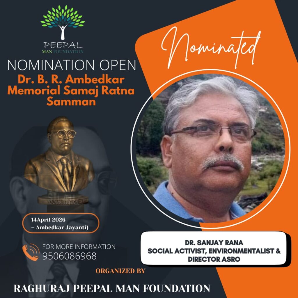 अभय सिन्हा एवं बड़ौत, बागपत से लेखक, सामाजिक कार्यकर्ता, पर्यावरणविद व एस्रो के निदेशक डा. संजय राणा प्रमुख हैं। उक्त जानकारी देते हुए फाउन्डेशन के प्रमुख डा. रघुराज प्रताप सिंह ने बताया कि इन सभी हस्तियों को आगामी महीनों में दिल्ली में आयोजित समारोह में सम्मानित किया जायेगा। गौरतलब है कि पिछले वर्ष भी दिल्ली में आयोजित भव्य समारोह में देश की जानी-मानी प्रतिभाओं को फाउन्डेशन ने प्रख्यात समाज सेवी बाबा आमटे मैमोरियल अवार्ड से सम्मानित किया था। उपरोक्त सभी प्रतिभाओं का भारत रत्न डा. बी.आर. अम्बेडकर मैमोरियल समाज रत्न सम्मान हेतु पीपलमैन फाउन्डेशन द्वारा नामांकित किये जाने पर वरिष्ठ पत्रकार एवं पर्यावरणविद ज्ञानेन्द्र रावत ने प्रसन्नता व्यक्त की है और समाज सेवा के क्षेत्र में महती भूमिका निर्वहन हेतु सभी नामांकित