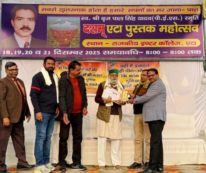 इस वर्ष की एक खासियत और है,वह यह कि मेरे गुरुवर श्री बृजपाल सिंह जी यादव की स्मृति मे हमारे ही राजकीय इंटर कॉलेज एटा के प्रांगण में हर वर्ष आयोजित पुस्तक महोत्सव सफलतापूर्वक 10 वर्ष पूरे कर चुका है। यह पुस्तक महोत्सव इस अंचल की महत्वपूर्ण उपलब्धि है जो भाई श्री संजीव यादव के कुशल दिशा निर्देशन में नित नये कीर्तिमान स्थापित कर रहा है। पद्मश्री राजा लक्ष्मण सिंह, मैग्सैसे पुरस्कार से सम्मानित प्रख्यात सामाजिक कार्यकर्ता डा. संदीप पाण्डेय, समाजविज्ञानी प्रो० नवीन झा, सर्व सेवा संघ के महासचिव भाई राजा अरविंद सिंह, विश्व जल परिषद के सदस्य डा. जगदीश चौधरी, जाने-माने गांधीवादी श्री रमेश भाई, उ. प्र. बाल एवं महिला कल्याण बोर्ड के अध्यक्ष जाने-माने सामाजिक कार्यकर्ता डा. कमर आलम साहब, प्रख्यात पत्रकार एवं नदी विषयक मामलों के जानकार श्री पंकज चतुर्वेदी, दिल्ली के विशेष पुलिस आयुक्त श्री अजय चौधरी, कांगो में शांति सेना का नेतृत्व कर चुके वरिष्ठ आई पी एस श्री उपेन्द्र बघेल , एडीजीपी सी आर पी एफ श्री अंशुमान यादव, पी ए सी कमांडेंट रहे आईपीएस श्री आदित्य प्रकाश वर्मा, पर्यावरणविद एवं वरिष्ठ पत्रकार श्री अनिल बहुगुणा, प्रख्यात नृत्यांगना एवं ग्राफिक इरा यूनिवर्सिटी देहरादून की प्रोफेसर डा. अनुभा पुंढीर, पर्यावरणविद श्री रामभरोस मीणा, उत्तर प्रदेश की राज्यपाल द्वारा नदी रत्न पुरस्कार से सम्मानित पर्यावरणविद श्री ब्रिजेन्द्र प्रताप सिंह, राज्य सूचना आयोग के सदस्य रहे मेजर संजय यादव आदि देश-प्रदेश के ख्यात शिक्षाविदों, समाजविज्ञानियों एवं प्रशासनिक अधिकारियों ने पुस्तक महोत्सव का अवलोकन कर इसकी भूरि-भूरि प्रशंसा की है और शैक्षणिक क्षेत्र में छात्र-छात्राओं के उन्नयन की दिशा में इसे मील के पत्थर की संज्ञा दी है। संयोग से मैं इस पुस्तक महोत्सव का संरक्षक भी हूं। असलियत में पुस्तक महोत्सव की सफलता के लिए भाई श्री संजीव यादव और श्री अनूप दुबे की समस्त टीम बधाई की पात्र है जिसके अथक परिश्रम से यह पुस्तक महोत्सव नित नयी ऊंचाइयों की ओर अग्रसर है। वह बात दीगर है कि मैं तो निमित्त मात्र संरक्षक हूं। लेकिन इसको जो समाज के विभिन्न क्षेत्रों से जो मान-सम्मान मिला है, उससे मैं अभिभूत हूं।