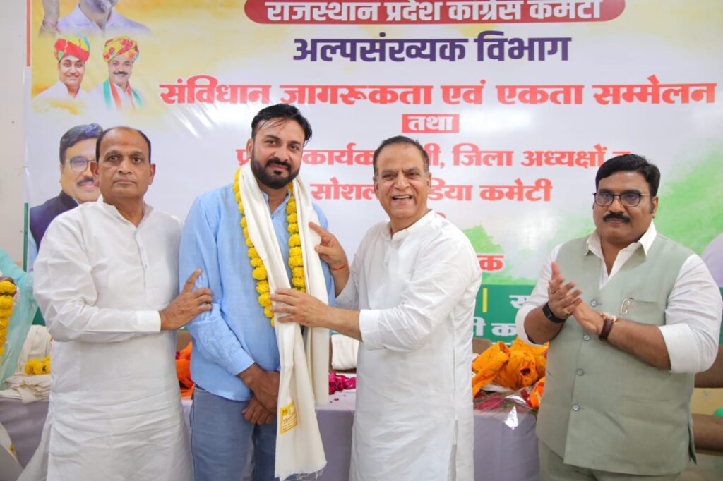 जयपुर। राजस्थान प्रदेश कॉंग्रेस कमेटी अल्पसंख्यक विभाग के प्रदेश अध्यक्ष एम ड़ी चोपदार व जयपुर जिला कॉंग्रेस कमेटी शहर के जिलाध्यक्ष सुनील शर्मा आदि नेताओ ने नदीम पठान प्रदेश सचिव अल्पसंख्यक विभाग राजस्थान को उनकी काबिलियत के दम पर स्वागत किया हैं उनको स्वागत करते समय पूरा हॉल तालियों से गूंज उठा।